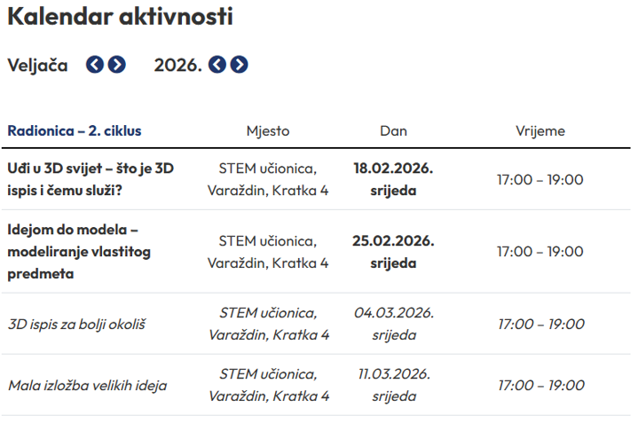 Mala škola će se održavati u vremenu od 18. veljače do 11. ožujka 2026. godine u STEM učionici HDIG, Varaždin, Kratka 4, svaku srijedu od 17 do 19 sati. Sva potrebna oprema, materijal i drugi troškovi Male škole financiraju se iz sredstava projekta te je sudjelovanje za učenike u potpunosti besplatno, a svaki učenik može se upisati u jednu Malu školu po slobodnom izboru.